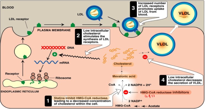 1. HMG-CoA를 콜레스테롤로 만드는 HMG-CoA 환원효소를 억제해서