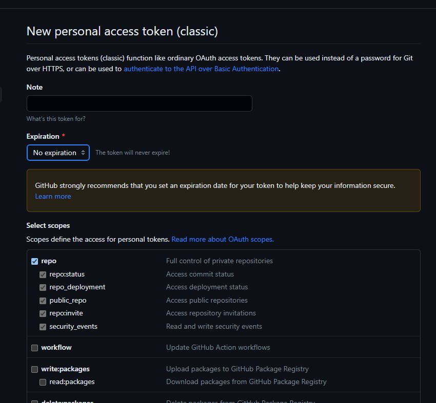 토큰으로 접근할 수 있는 것들을 결정하여 선택. 보통은 repo만 선택하면 충분.
