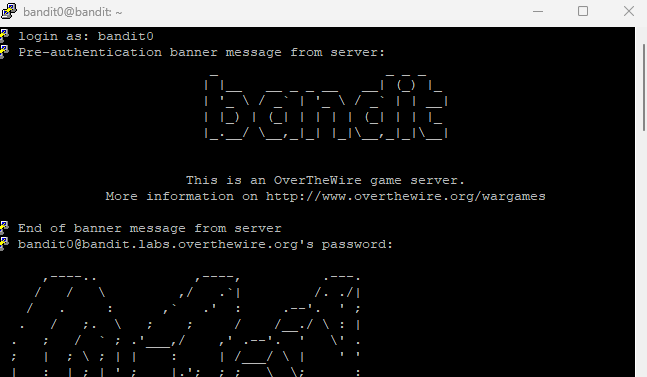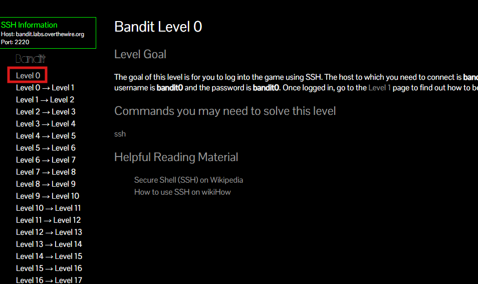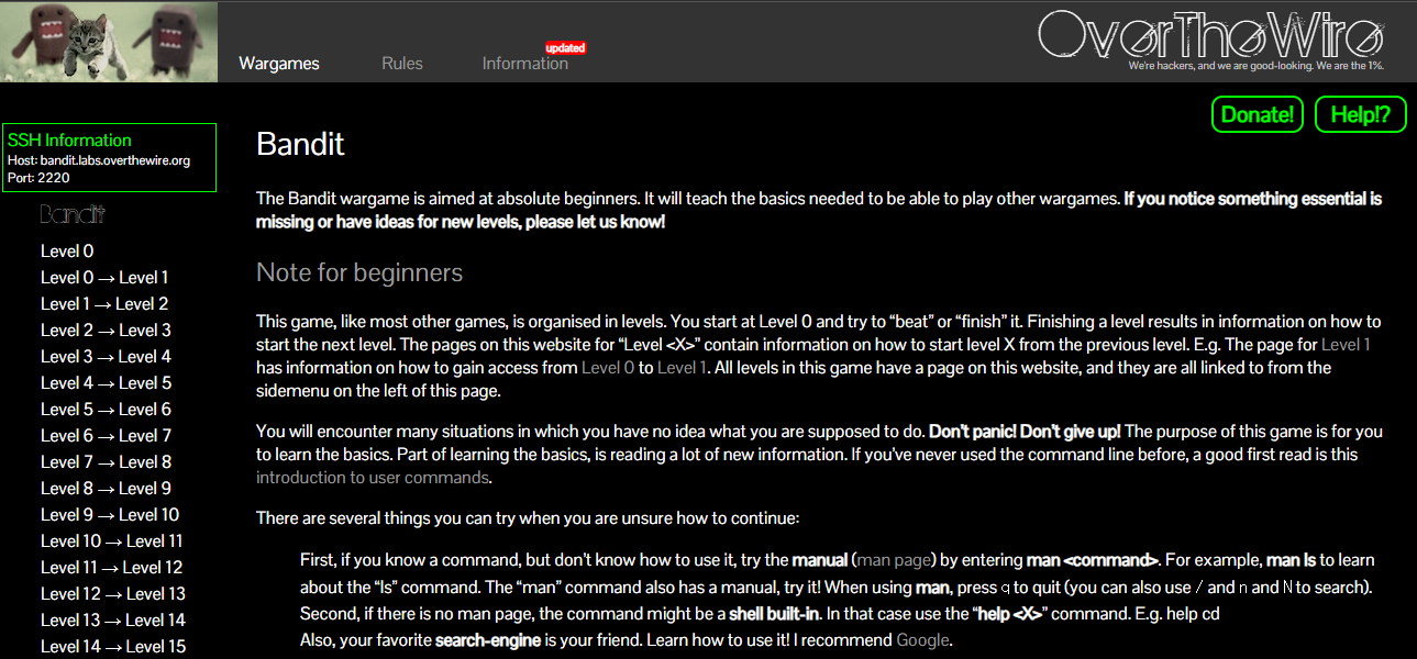 We're hackers, and we are good-looking. We are the 1%. <!-- Please read and accept the Rules! --> Bandit The Bandit wargame is aimed at absolute beginners. It will teach the basics needed to be able to play other wargames. If you notice something essential