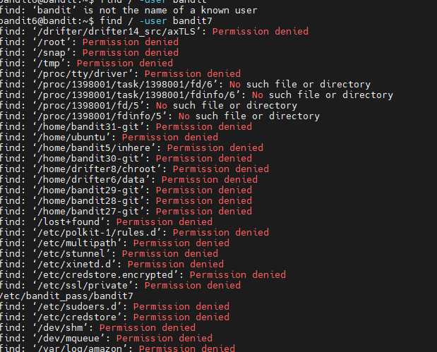 user가 bandit7인 것을 찾으니 permission denied가 나오면서 화면이 가득 채워짐.