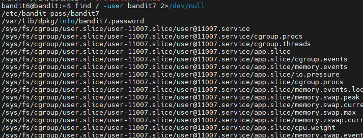 명령어: find / -user bandit7 2>/dev/null