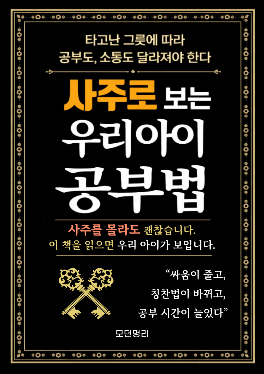 Copyright 2025. 모던명리 All rights reserved. 본 콘텐츠는 저서 **<사주로 보는 우리 아이 공부법>**의 내용을 바탕으로 작성되었습니다. 모든 글과 이미지의 저작권은 저작권자에게 있으며, 무단 전재 및 재배포를 금지합니다. ⓒ 모던명리. All rights reserved.