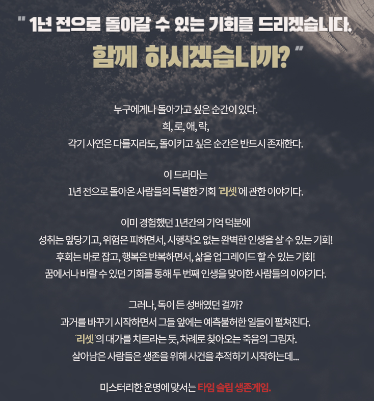 1년 전으로 돌아가서 각자의 운명을 바꾼다는 컨셉으로 시작된 이 드라마는