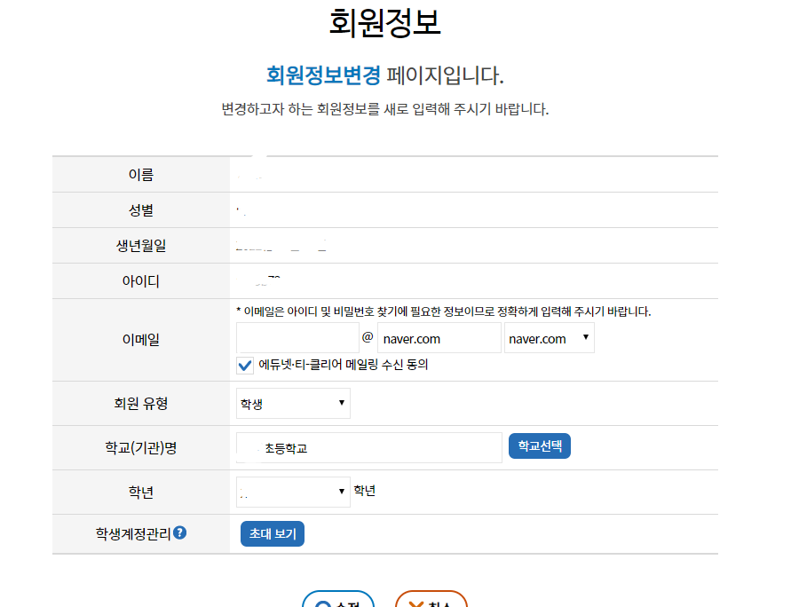 학교명과 학년 정보가 맞는지 확인한 후 잘못되어 있으면 수정한다.