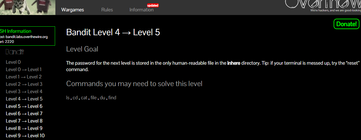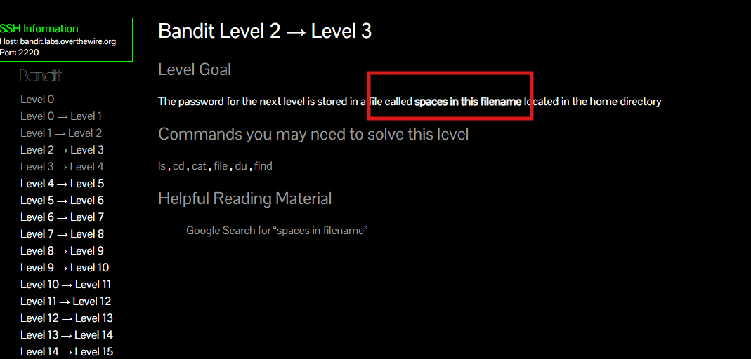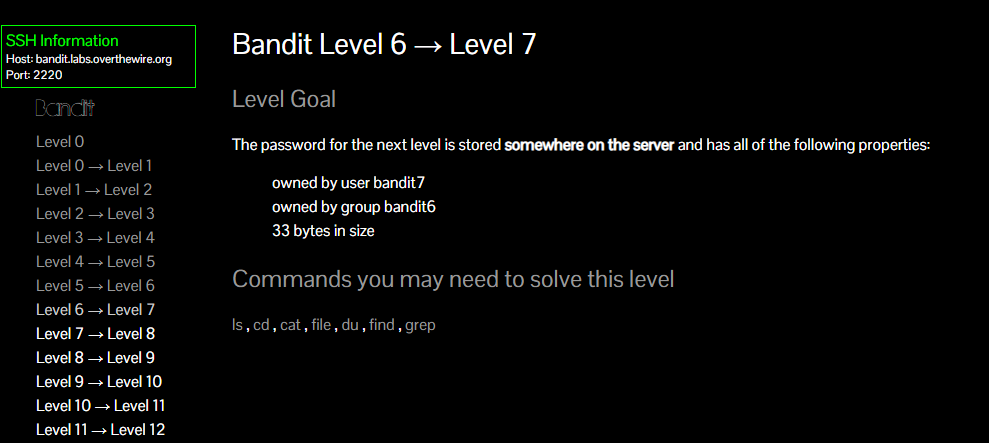 Bandit Level 6 → Level 7 Level Goal The password for the next level is stored somewhere on the server and has all of the following properties: owned by user bandit7 owned by group bandit6 33 bytes in size Commands you may need to solve this level ls , cd , cat , file , du , find , grep user가 bandit7인 것을 찾으니 permission denied가 나오면서 화면이 가득 채워짐.리눅스에서 쓰레기통명령인 2>/dev/null을 사용 에러명령어가 나타나지 않게 하려면 Fil..